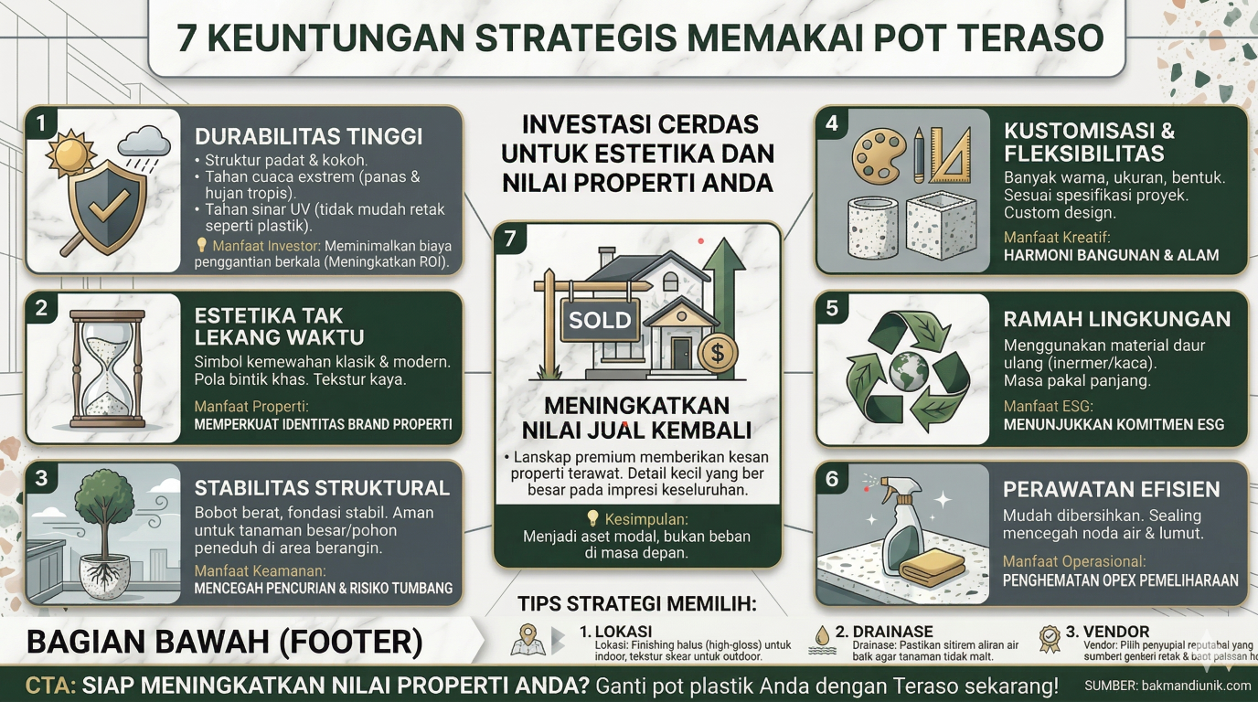 Berikut adalah analisis mendalam mengenai 7 keuntungan strategis menggunakan pot teraso sebagai solusi pot tanaman terbaik untuk aset properti Anda.